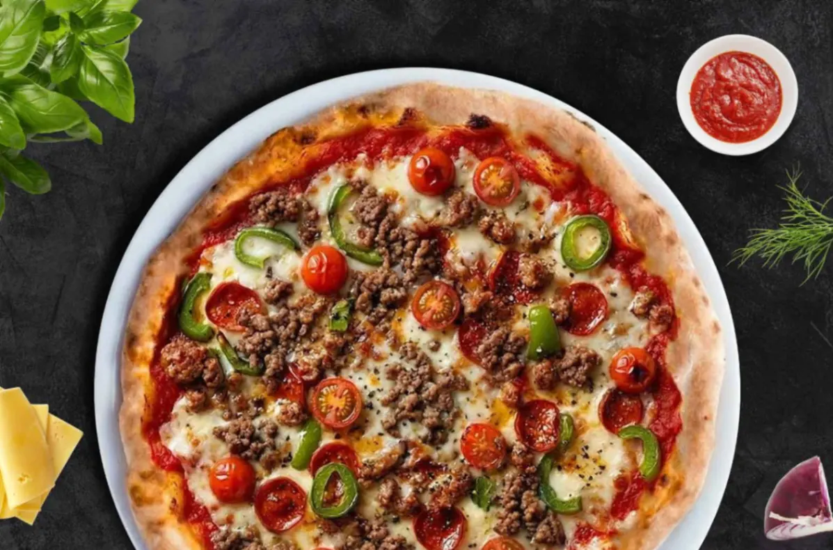 Sauce tomate, Mozzarella, Viande hachée, Pepperoni, Oignons, Origan